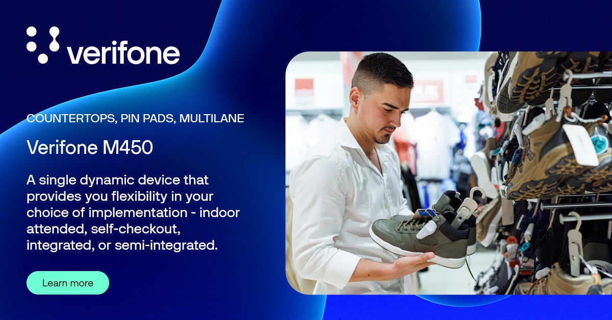 Promote your brand, showcase promotions and encourage customer loyalty. You can even use the M450 to train new team members or for document signing. Implement this flexible payment device as fits your need - attended or self-checkout. Need a bit more counter space? Select the Verifone M425 - all the same features as the M450 in a smaller footprint.