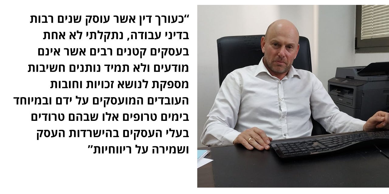 “כעורך דין אשר עוסק שנים רבות בדיני עבודה, נתקלתי לא אחת בעסקים קטנים רבים אשר אינם מודעים ולא תמיד נותנים חשיבות מספקת לנושא זכויות וחובות העובדים המועסקים על ידם ובמיוחד בימים טרופים אלו שבהם טרודים בעלי העסקים בהישרדות העסק ושמירה על ריווחיות”