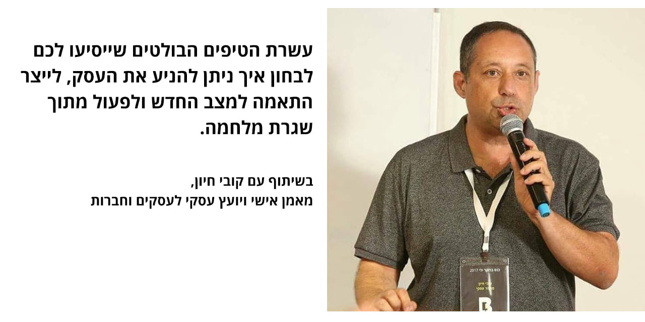 תקופת מלחמה היא תקופה מורכבת גם בהיבטים הקשורים להתנהלות העסקית של המשק בכלל ובהתנהלות של עסקים קטנים בפרט. כל שכן המלחמה אותה אנחנו חווים בימים אלו, בשל עוצמתה יוצרת תחושת אבל לאומי. ההבנה כי השגרה אינה יכולה להתקיים פוקדת כל בית בישראל, בין אם מתוך חוויה אישית או בין אם מתוך תחושת הזדהות לאומית, מצב זה משתק את השוק הישראלי. בשיתוף עם קובי חיון, מאמן אישי ויועץ עסקי לעסקים וחברות ריכזנו את עשרת הטיפים הבולטים שייסיעו לכם לבחון איך ניתן להניע את העסק, לייצר התאמה למצב החדש ולפעול מתוך שגרת מלחמה. “עושים עסקים תחת אש”