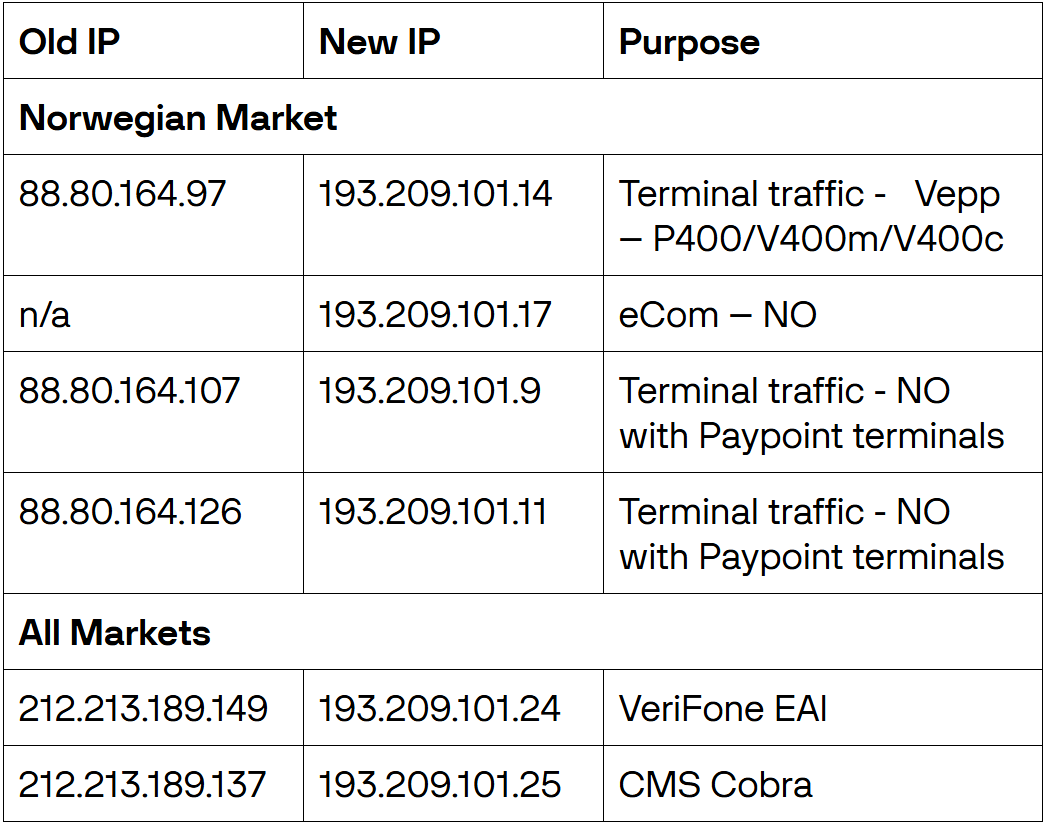 Verifone will control the terminal parameter updates, and integrations, however, customer networks may require firewall or routing changes to ensure new services in the network (193.209.101.0/27) are available over your internet service. All destination addresses use port 443 as before.
